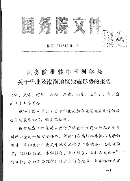 State Council Endorses Chinese Academy of Sciences’ Report on the Earthquake Situation in North China and the Bohai Sea Area
